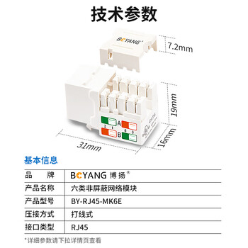 博扬(BOYANG)六类网络模块 工程级打线式信息模块 (50μ"镀金)CAT6网线RJ45连接头 BY-RJ45-MK6E *1 合格证*1