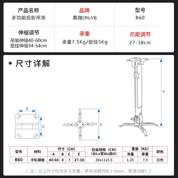 英微(IN&VI)投影仪支架B60吸顶投影吊架家用床头吊装可调节伸缩微型壁挂架办公多功能通用 长度40-60cm