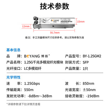 博扬 BY-1.25GM2 SFP光模块千兆1.25G多模双纤光纤模块(850nm,550m,LC)适配国产交换机SFP-GE-SX-MM850-A*1 合格证*1 保修卡*1