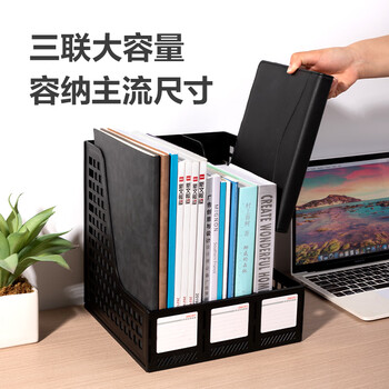 得力(deli)3联镂空桌面文件框栏书立架档案收纳盒 办公室带标签资料文件置物架书本资料收纳神器 黑色27666