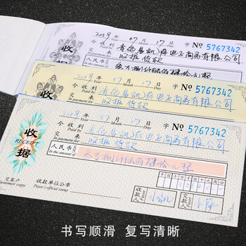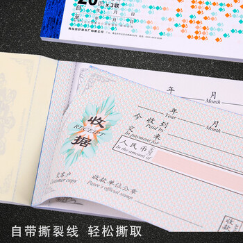 1、极细线条组合而成的四色团花防伪底纹,另加特有防伪暗记,大大增加了票据使用的安全性; 2、高技术压痕系统,保证每一张内页的易撕线均可轻松撕断,方便好用; 3、选用无碳复写纸,纸质细腻,书写流畅,字迹显色快速清晰,存档时间可达15年不褪色,满足财会需求; 4、加厚顾客联,让客户处处体验不一样的感觉; 5、专用号码字体,数码清晰,便于存档查找;