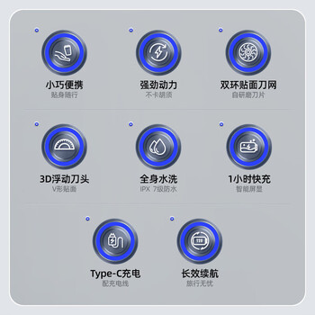 剃须刀*1、TYPE-C数据线*1、说明书*1、旅行盒*1、保护盖*1