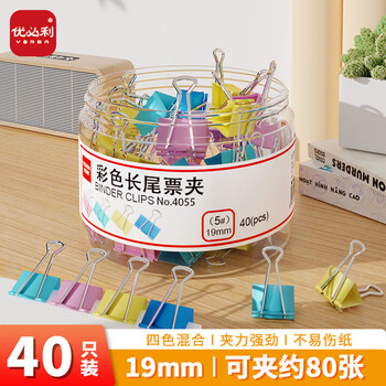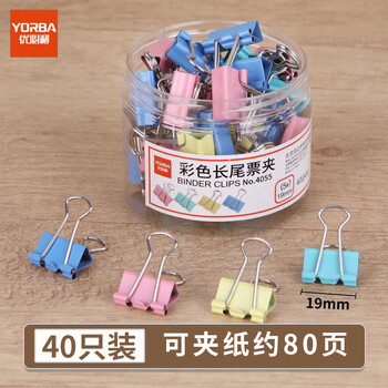 优必利 长尾夹彩色燕尾夹金属铁夹凤尾夹文件夹蝴蝶夹小夹子 办公用品资料固定票夹 19mm40只/筒 4055