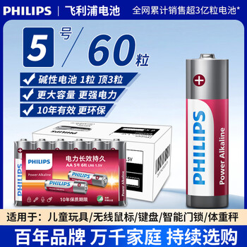 飞利浦(PHILIPS)碱性5号电池60粒/6粒干电池 十年聚能锁电适用儿童玩具鼠标智能门锁/指纹锁剃须刀血压计电池5号