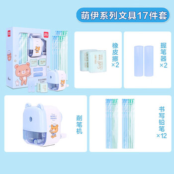 得力(deli)萌咿系列学生文具礼盒套装1-2年级铅笔卷笔刀橡皮握笔器精美伴手礼生日礼物考试用品开学文具17件