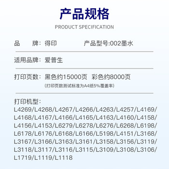得印002墨水 适用爱普生L3251墨水L4168 L4165 L4266 L4267 L4166 L4263 L6279 L4158 L6178打印机墨水 四色套装