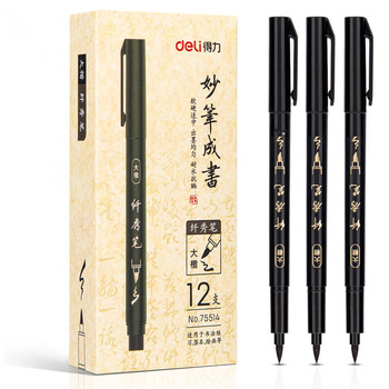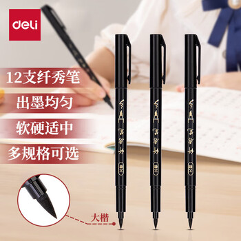 得力黑色大楷纤秀笔秀丽笔毛笔练字笔 软笔签名绘画学生成人书法练习笔开学礼物 12支/盒开学用品