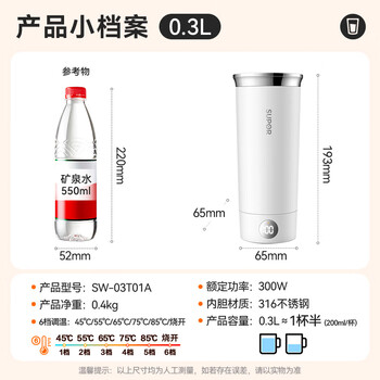 苏泊尔(SUPOR)电热水杯 随行烧水杯0.3L 便携式保温烧水壶316不锈钢 旅行冲奶 办公室电水壶SW-03T01A