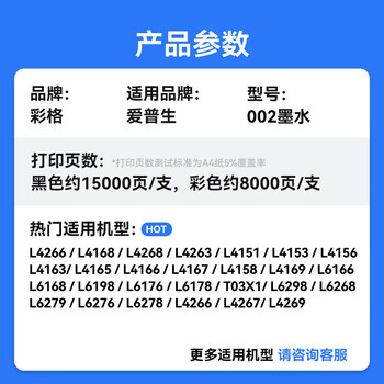彩格适用爱普生002墨水蓝色L4267 L4153 L4156 L4158 L4266 L4168 L4269 L6166 6168 L6278 L14158打印机墨水
