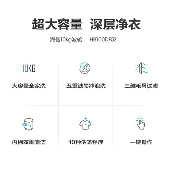 海信(Hisense) 波轮洗衣机全自动 10公斤大容量 10大洗衣程序 桶清洁快洗 家用智能一键洗 HB100DF52