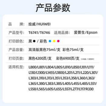 绘威T674墨水 适用爱普生L805 L1800 L850 L801 L810 L800 L801 L360 epson墨仓式打印机墨水 T6741-6 六色套装