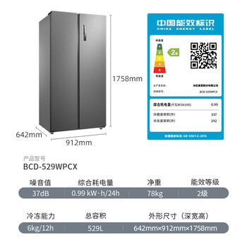 | 容积 | 总容积529L;冷藏337L;冷冻192L |