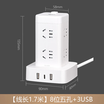 德力西(DELIXI)立式插座/插排/排插/插线板/插板/接线板 8位五孔USB+TYPE-C总控开关1.7米过载保护