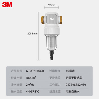 3M净水器家用净水机无需换芯40微米过滤全屋净水前置过滤器 QTURN-40GR