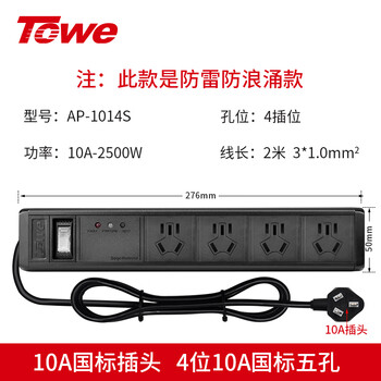 TOWE同为经济款防雷桌面PDU插座防浪涌抗电涌插座防雷排插线板插座铝合金外壳防雷插排 AP-1014S