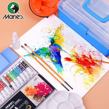 马利(Marie's)水粉颜料盒装12色12ml 工具箱调色盘洗笔桶水彩纸海绵喷壶画笔套装 写生绘画水粉画颜料套装美术写生