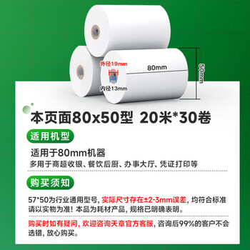 天章 (TANGO)80*50mm20米*30卷 新绿天章热敏收银纸 京东外卖餐饮后厨小票纸 商超收银凭证打印纸 适配80mm机器