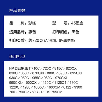 彩格45黑色墨盒 适用惠普HP 710c 720c 815c 830c 850c 870cxi 1180c 1220c 1280 3820 5110 9300桌面打印机
