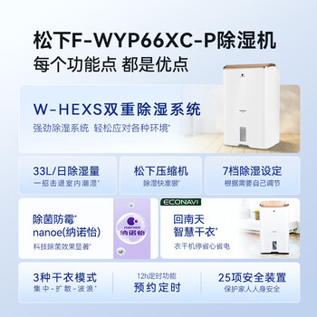松下(Panasonic)除湿机/抽湿机 除湿量33升/天 70㎡家用地下室大功率轻音干衣回南天吸湿器F-WYP66XC-P