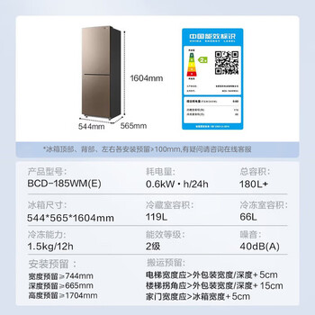 | 容积 | 总容积185L;冷藏119L;冷冻66L |