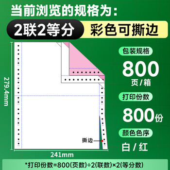 新绿天章二联二等分可撕边 针式电脑打印纸 (241-2-1/2S 白红 800页/箱)