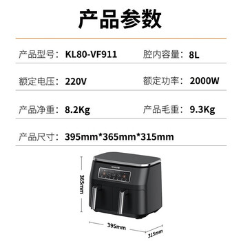 九阳(Joyoung)空气炸锅 家用智能多功能 双腔8升大容量 不粘易清洗 无油煎炸电炸锅 KL80-VF911