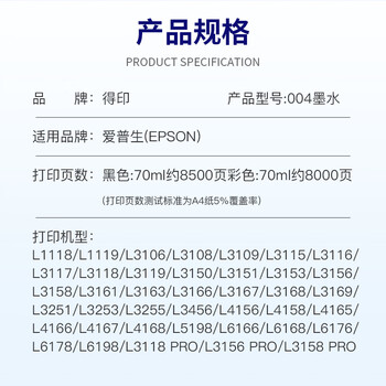 得印适用爱普生004墨水L3255 L3153 L1258 L3258 L3118 L3219 L3251 L3258 L3256 L3118 epson打印机墨水 黑色