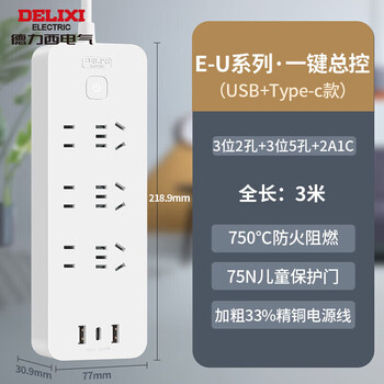 德力西(DELIXI) USB插座 插线板/插排/排插/拖线板/插板Type-c口+USB口+6插孔全长3米 总控开关