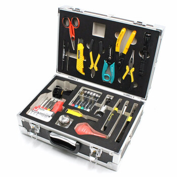 光纤剥纤钳×1,光缆横向开剥刀(3-32mm)×1,凯弗拉剪刀×1,精密螺丝批组×1,光缆松套管开剥钳×1,新型带锁酒精泵100ml×1,钢丝钳(7寸) ×1,斜口钳(6寸)×1,尖咀钳(6寸)×1,活络扳手(8寸)×1,光缆加强芯剪断钳×1,8件组合螺丝刀×1,吹气球带清洁毛刷×1,高亮度手电筒×1,精密镊子×1,实用电工刀×1,3.5米卷尺×1,黑色记号笔×1,增强型工具箱(385×275×110mm)×1