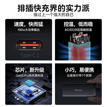 倍思 氮化镓桌面插线板 2AC+2U+2C 100W 中规 黑(含:小白系列 快充数据线Type-C To Type-C 100W(20V/5A)1m 黑色)*1