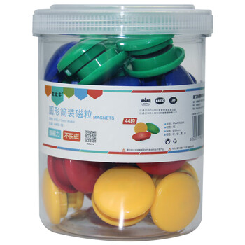 品名:比比牛 筒装圆形白板磁粒PNM-R3044 强磁44粒30mm磁扣磁铁磁吸磁力片 品牌:比比牛 编号:PNM-R3044 规格:30*11mm筒装磁粒44个、红/黄/绿/蓝四色混装 包装:食品级塑料筒包装 适用:教学培训、会议办公 属性:白板辅助固定用品