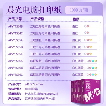 晨光(M&G)文具四联二等分电脑打印纸 彩色针式打印纸241-4-1/2 80列 撕边 色序:白红蓝黄 1000页/箱APYY6S66