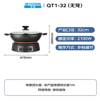 半球(PESKOE)电炒锅32CM铸铁多功能锅电热锅大功率多用途锅电锅电煮锅电火锅QT1-32 无蒸笼
