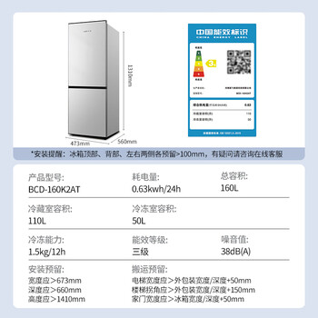 | 容积 | 总容积160L;冷藏110L;冷冻50L |