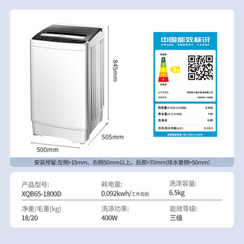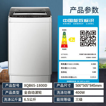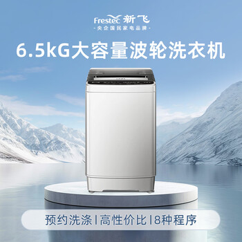 新飞(Frestec)6.5公斤全自动波轮洗衣机 8程序8水位 智能预约洗衣 一键快洗 双重洁桶 XQB65-1800D