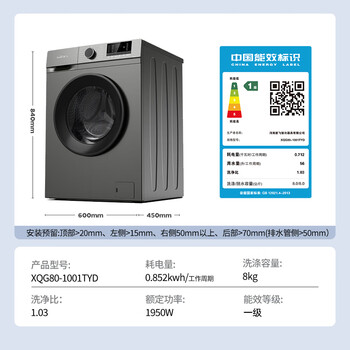 新飞(Frestec)8公斤滚筒洗衣机全自动 大容量 欧标 健康除螨洗省电节能 XQG80-1001TYD 送装一体
