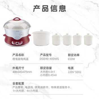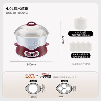 天际(TONZE)电炖锅 电炖盅 隔水炖锅 煲汤锅炖汤锅 熬粥养生锅 煮粥锅 蒸炖一体 白瓷5胆 DGD40-40DWG 4L
