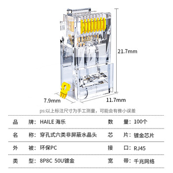 海乐(Haile)六类穿孔式水晶头镀金网线接头100个装HT-510A