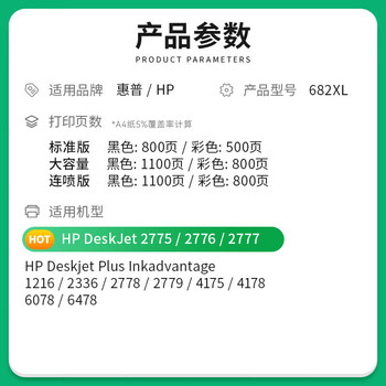 才进适用惠普682墨盒2336 2775 2776 2777 2778 2779打印机可加墨4175 4178 6078 6478 1216 1200 6400黑色XL