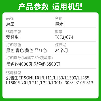 京呈T6721墨水黑色适用爱普生T672/674墨水L360 L130 L380 L1300 310 383 351 313 565 301 363 epson墨仓式打印
