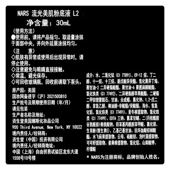 NARS超方瓶流光美肌粉底液L2 MONT BLANC 中1白 30ml 礼物送女友
