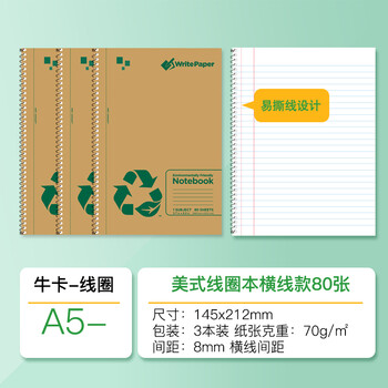 凯萨(KAISA)线圈笔记本牛卡面横线笔记美标A5 × 3