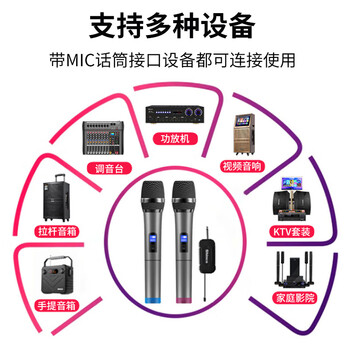无线话筒*2支,接收器*1, 充电线*1,转接头*1,试机电池*4,话筒套*2,防滑圈*2,说明书,*1,合格证*1