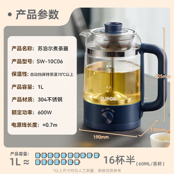 苏泊尔(SUPOR)养生壶煮茶器泡茶烧水壶电水壶热水壶烧水壶电热水壶办公家用304不锈钢玻璃花茶壶白茶SW-10C06