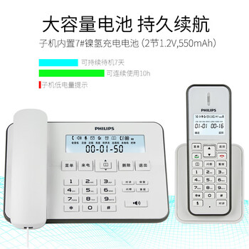 飞利浦(PHILIPS)无绳电话机 无线座机 子母机 办公家用 中文菜单 双免提 扩展子机 DCTG192白色