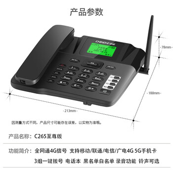 中诺全网通无线固话插卡电话机支持广电移动联通电信4G网兼容联通3G网家用办公座机C265至尊版黑色