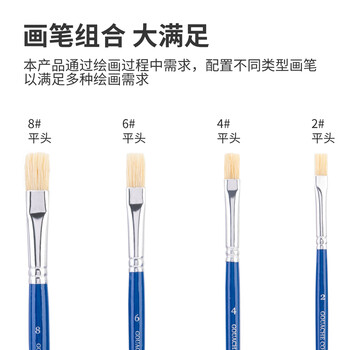 "产品尺寸:27*7*1cm 产品重量:0.045kg 产品特性:品类齐全,适合艺考写生 规格:4号、6号、8号圆头画笔3支,6号舌形画笔1支,4号、8号平头画笔2支 购买人群:学生老师成人等专业人群 使用场景:艺考、彩绘、美术教学、兴趣培养"