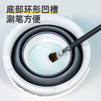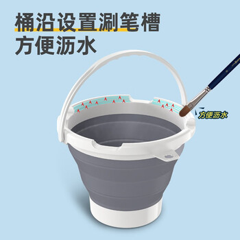 产品名称:美术洗笔桶 属性特点: 1.可折叠便携设计。 2.底部环形凹槽涮笔槽,方便使用。 3.桶沿设置涮笔槽,方便沥笔。 4.桶沿凹槽设计,可晾置画笔。