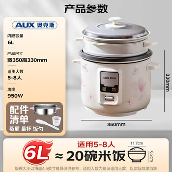 奥克斯(AUX)电饭煲6L电饭锅 5-8人直身式带蒸笼 操作简单 家用小电饭锅WZA-0602