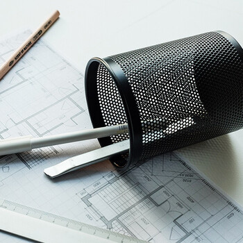 得力(deli)笔筒909密集金属网纹圆形笔筒黑色铁网收纳筒简约办公室收纳时尚经典学生用创意桌面收纳盒